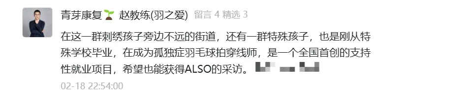 文章发出后,我们收到一条留言:在这一群刺绣孩子旁边不远的街道,还有一群特殊孩子,也是刚从特殊学校毕业,在成为孤独症羽毛球拍穿线师,是一个全国首创的支持性就业项目。留言作者是上海“青芽运动康复”创始人赵勇教练。