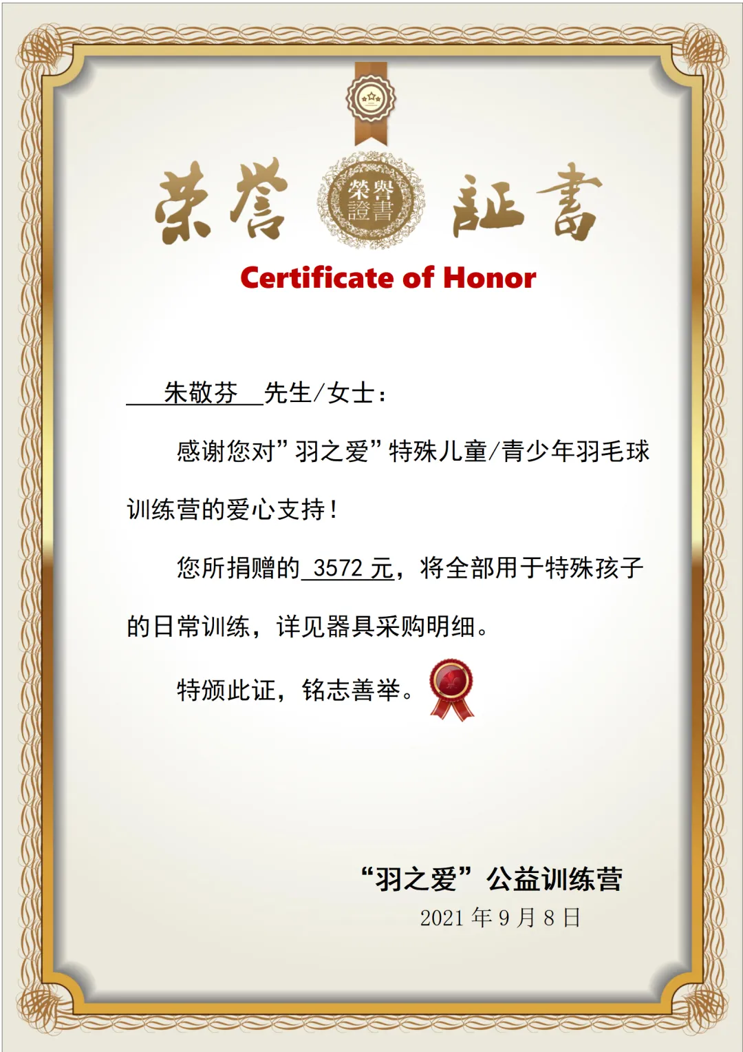 捐赠日期:2021年9月8日